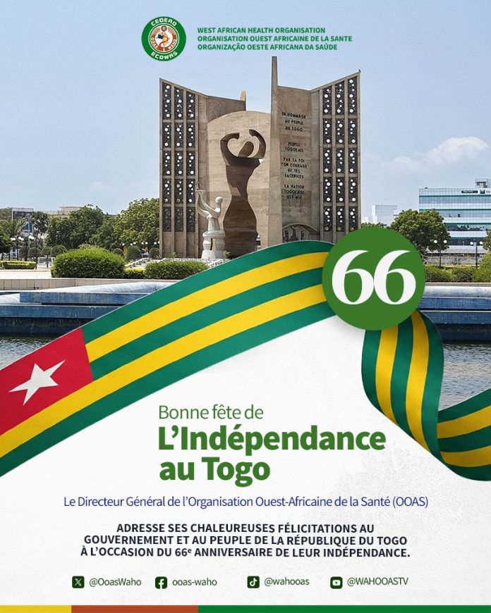 (IMPARTIAL ACTU)- À l’occasion du 66ᵉ anniversaire de l’indépendance de la République togolaise, l’Organisation Ouest-Africaine de la Santé (OOAS) a adressé ses vives félicitations au Gouvernement et à l’ensemble du peuple togolais. Ce message de solidarité traduit la reconnaissance du rôle actif du Togo dans la construction d’une communauté régionale soudée et tournée vers le progrès.