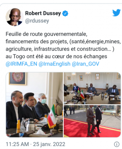 (IMPARTIAL ACTU)- Le chef de la diplomatie togolaise, Prof Robert Dussey fait les yeux doux aux autorités iraniennes. Le ministre des affaires étrangères du Togo, séjourne depuis lundi à Téhéran où il a poursuivi mardi les travaux de sa visite officielle de travail.