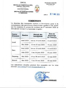 (IMPARTIAL ACTU)- La Direction des Transports Routiers et Ferroviaires (DTRF) porte à la connaissance des promoteurs d’auto-écoles agréées et du public que les dates des examens de permis de conduire du 1er semestre 2025 sont désormais connues.